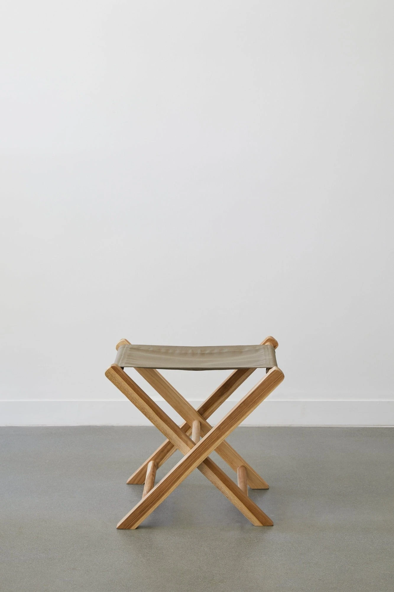This traveled and contemporary take on a director’s stool is a minimalist’s dream. Use as an accent piece to complete any room or pair it with our Director’s Chair to make a full set. Our Canvas Folding Stool is also perfect for adding additional seating for indoor or outdoor dining. Small and easy to store, just fold them up to tuck away until they are needed next! The Canvas Folding Stool features a hand-carved teak frame in a natural matte finish, and a hammock style seat in a beautiful taupe canvas fabric.