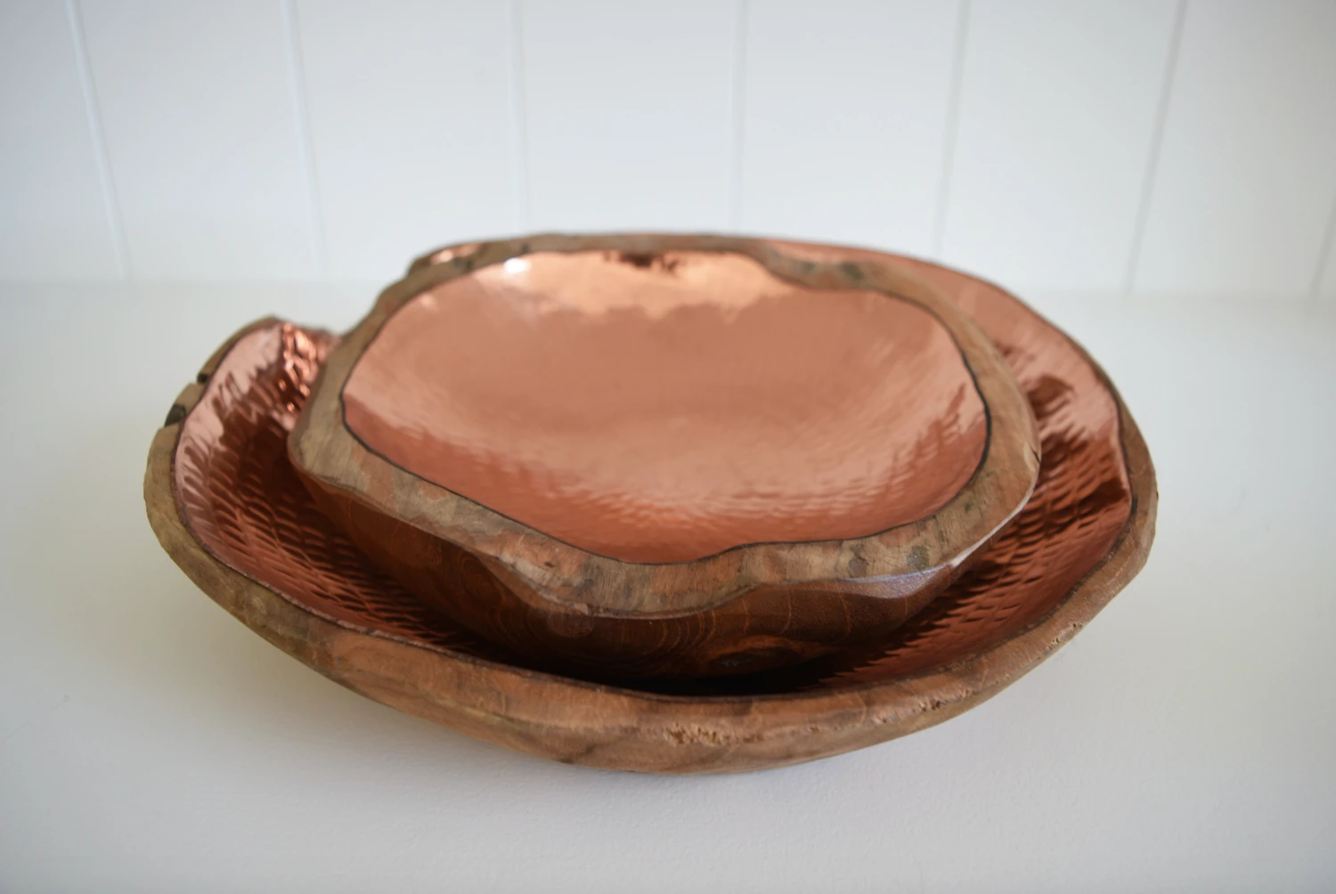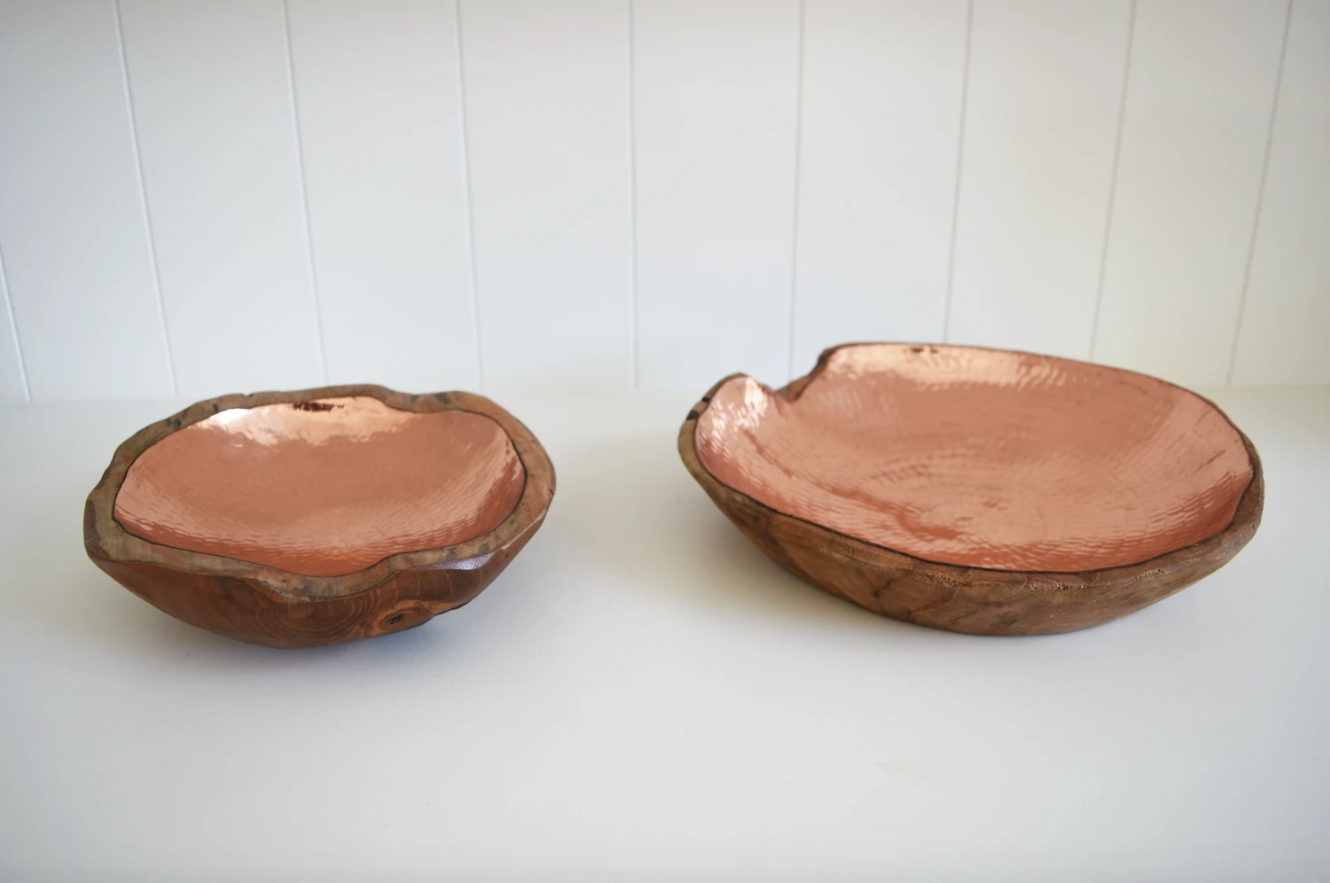 Elevated and organic, these copper and teak root bowls make a natural yet luxurious accent to any space. We love to show them off styled on a console, table, or collected shelf. Accessory meets art when paired with our wood Bali Beads draped in the bowl or used as a decorative landing spot for collected treasures. But feel free to put these lovely bowls to work as a catch-all by an entryway or by your bedside. Featuring hand carved teak root in a natural matte finish lined with a hammered copper interior finish.