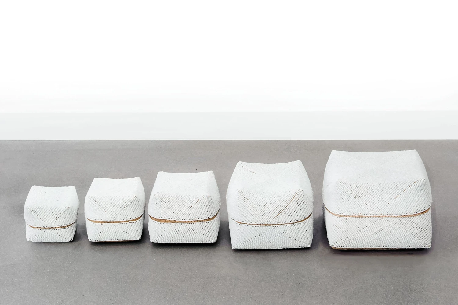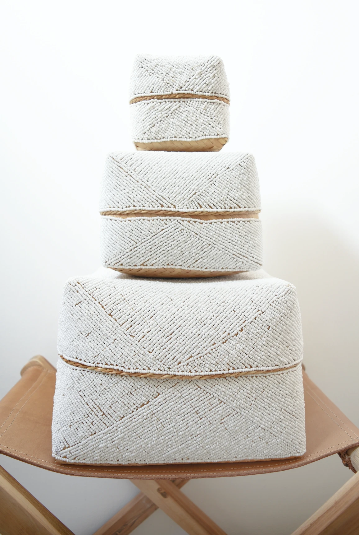 Handcrafted in Denpasar, Bali using seed beads on woven bamboo. This style features crisp white beads all over. These baskets are first woven out of sustainable bamboo, and then each basket is hand-beaded with seed beads. All materials are sustainable and locally sourced in Bali.