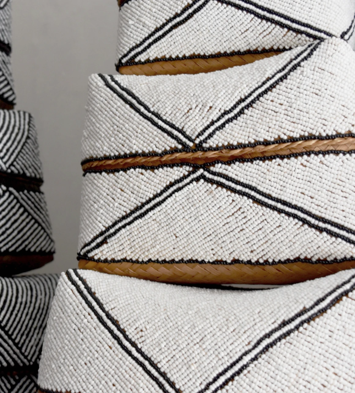 Handcrafted in Denpasar, Bali using seed beads on woven bamboo. This style features crisp white beads with a geometric diamond motif in black beads. These baskets are first woven out of sustainable bamboo, and then each basket is hand-beaded with seed beads. All materials are sustainable and locally sourced in Bali.