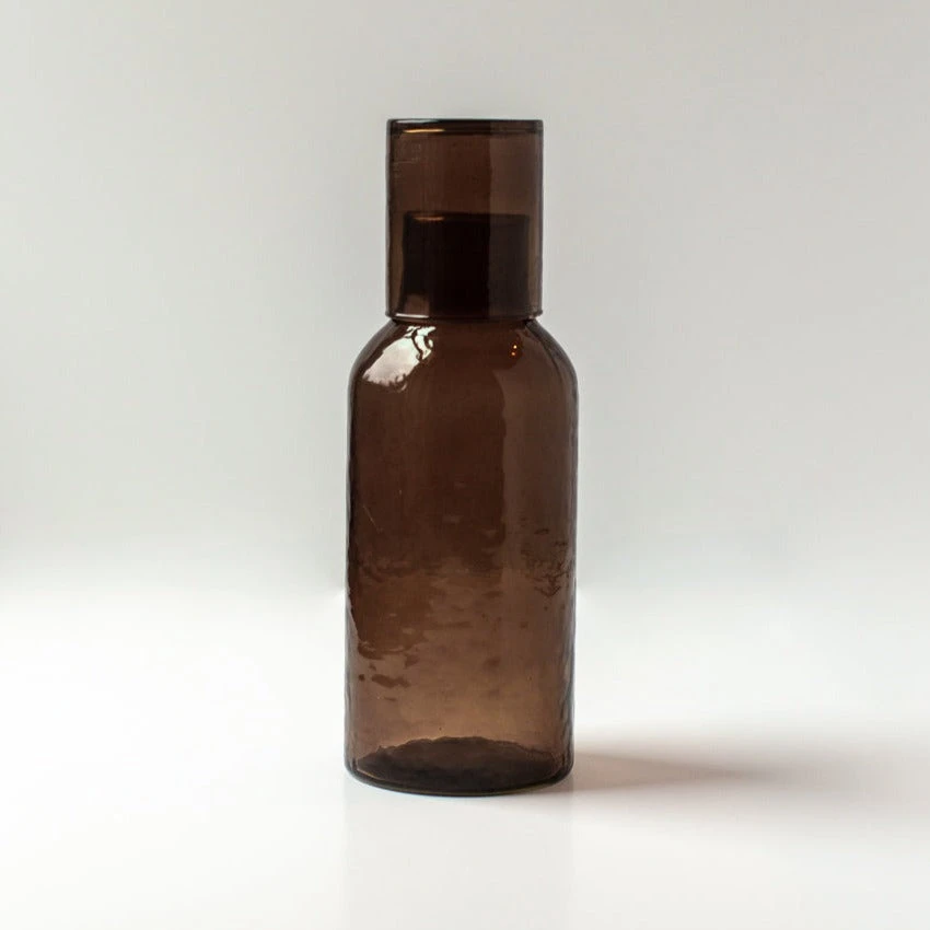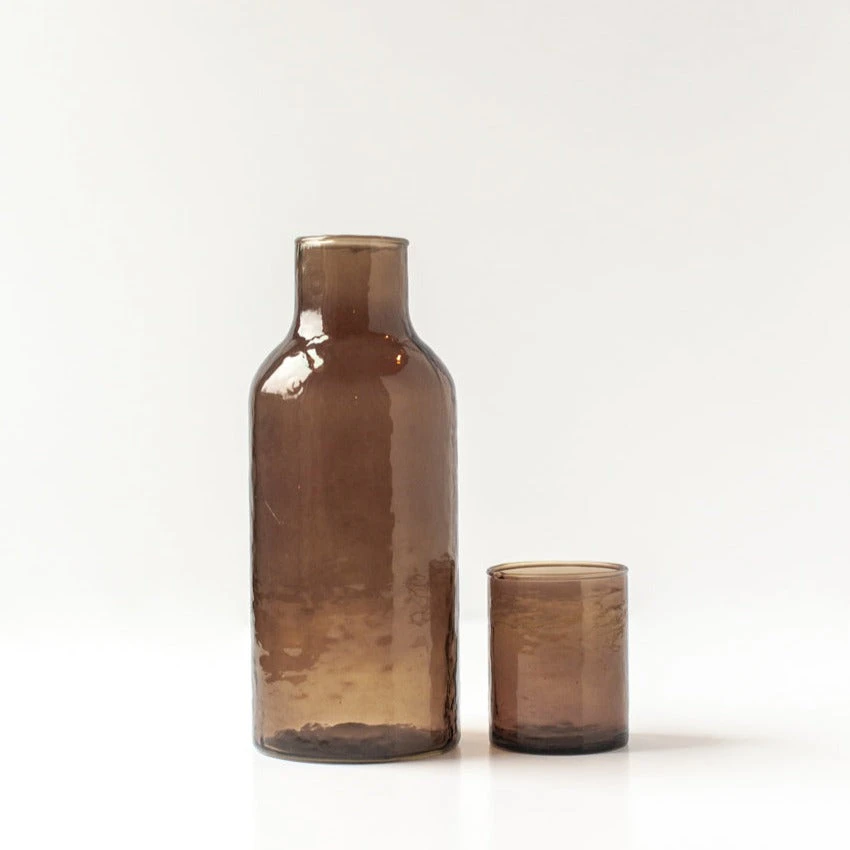 Form meets function in these stunning glass carafes. Each is handblown from recycled glass then meticulously hammered by hand for a truly unique finish. The set includes a carafe and lid that doubles as a small drinking glass. Dishwasher safe.