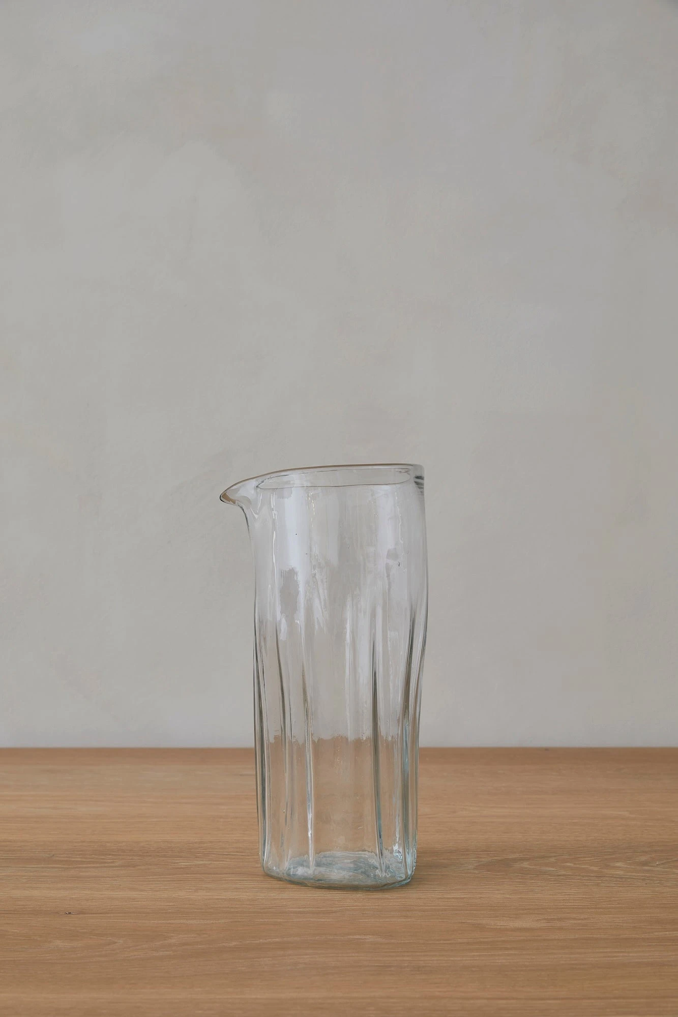 Add a touch of artisanal beauty to your tableware with this Handblown Glass Pitcher. Expertly crafted from recycled glass in Oaxaca, Mexico, this pitcher is made using traditional hand-blown glass techniques, and is designed to be used for any beverage from water to margaritas and more. When not in use for beverages, this pitcher is elegant enough to be displayed on your table filled with fresh-cut flowers, adding a touch of natural beauty to your decor. With its unique texture and classic shape, this pitcher infuses your home with elements of both beauty and sustainability.