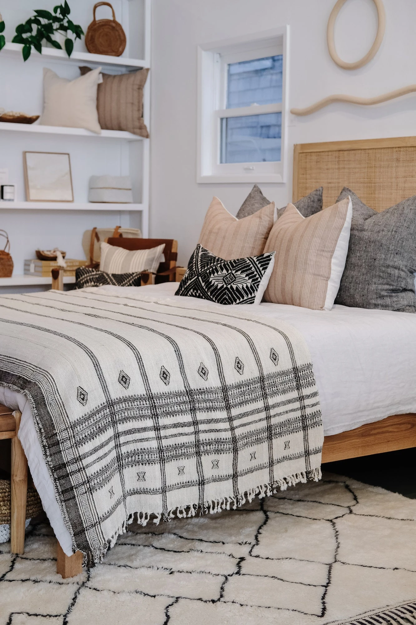 Our Bhujodi Blanket is a traditional Indian textile featuring woven pastoral motifs and intricate textural details. The perfect statement textile to add an elevated and traveled vibe to your space! They are the ideal size to be used as a bedcover for a Queen sized bed or as an accent blanket on a King or Queen. The Bhujodi Blanket is equally excellent to use as a throw on a sofa or lounge chair.