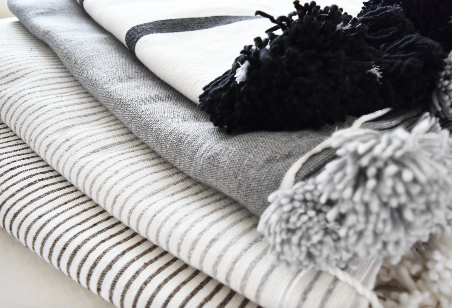 These Moroccan Pom blankets are hand-woven by artisans in Marrakech using traditional techniques + wooden looms. They are made out of 100% handspun cotton, and are very soft to the touch. Please note that because these are handwoven they may vary slightly from piece to piece.