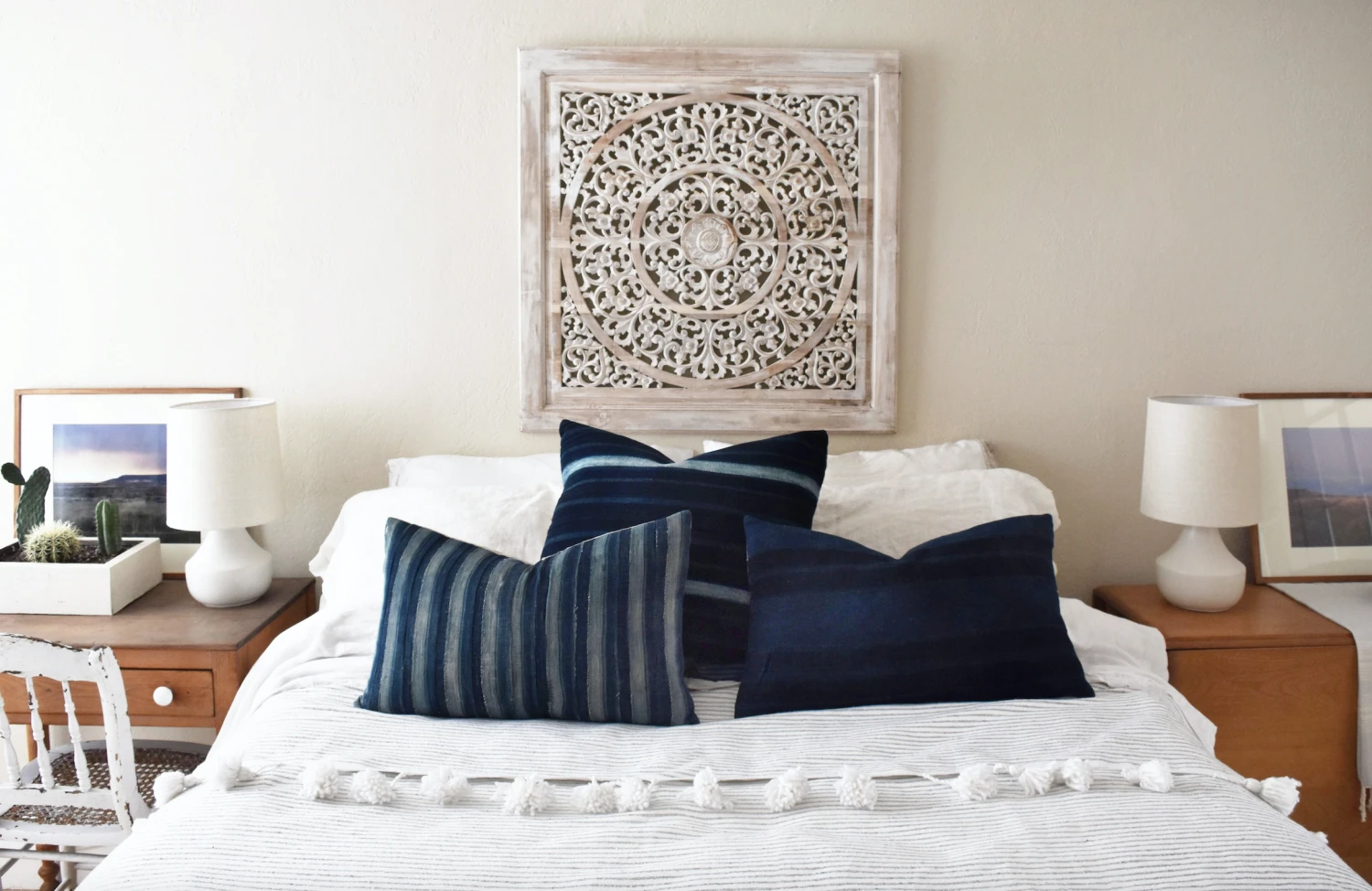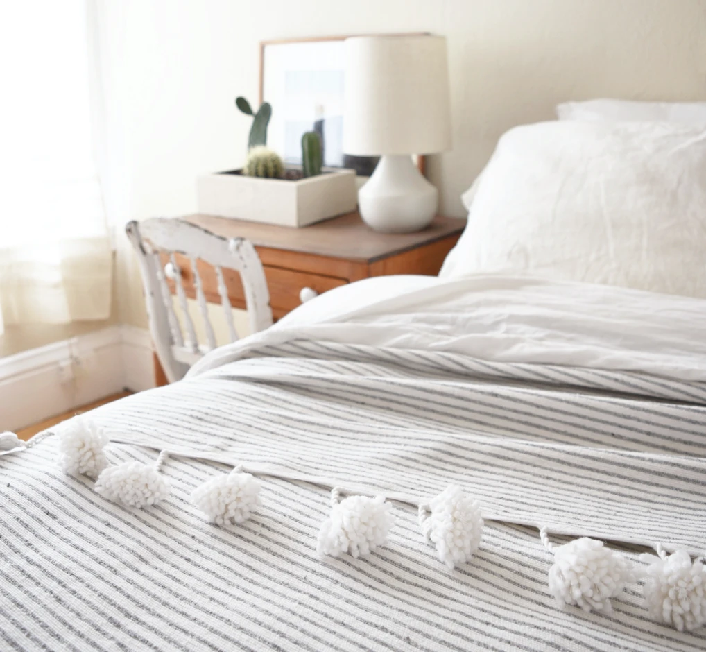 This gorgeous Moroccan Pom Bed Throw is a traditional Moroccan textile that lends perfectly to a sophisticated bohemian style. It features classic light grey and white stripes with oh-so-fun oversized pom tassels that line two sides of the throw. They are the ideal size to be used as a coverlet for a Full/Queen bed as shown, but also look beautiful spread at the base of a King bed with tassels on the sides, or used as a throw on your sofa!