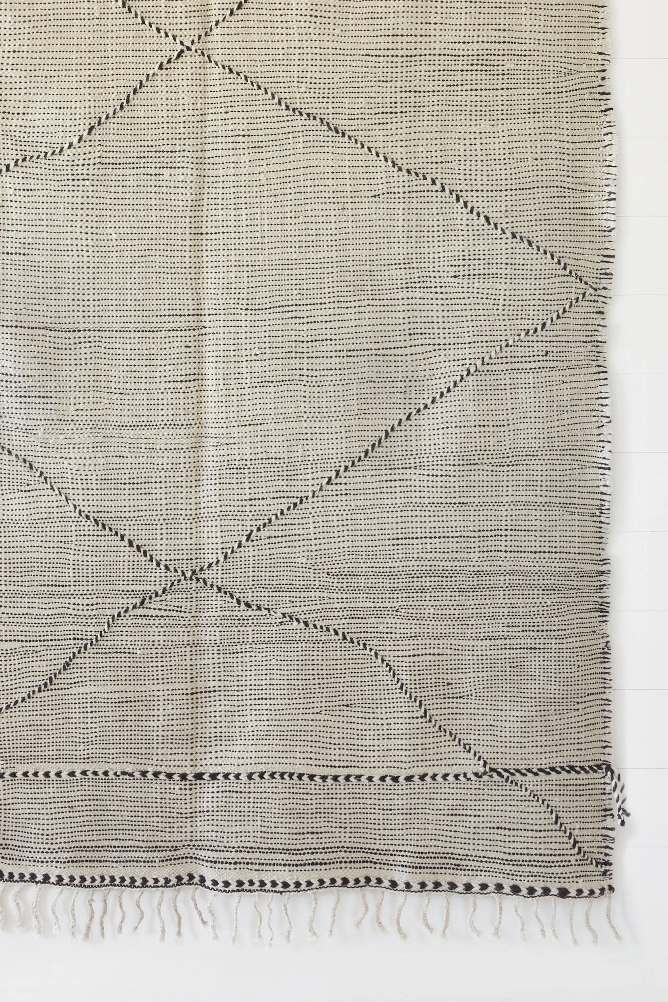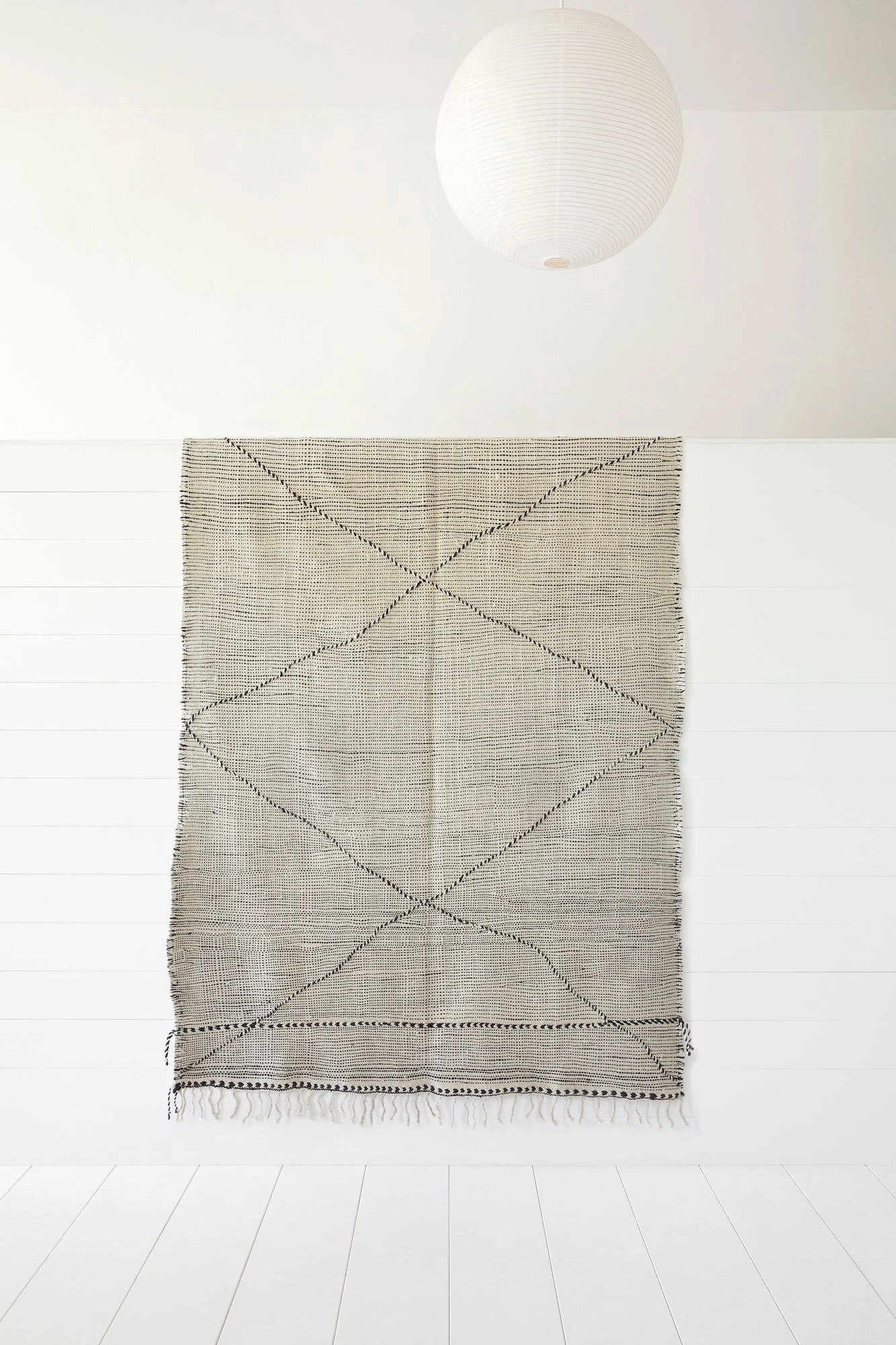 Our collection of flat woven Moroccan Kilim Rugs are selected for their classic bold and intricate geometric designs in a versatile two-tone colorway. Timeless and traveled, they make the perfect statement piece for any living area or bedroom. This rug features intricate thin lines with a large diamond pattern and two sides of fringe. It is the perfect size for placing under a queen-sized bed or creating a cozy foundation for two lounge chairs in your living space.