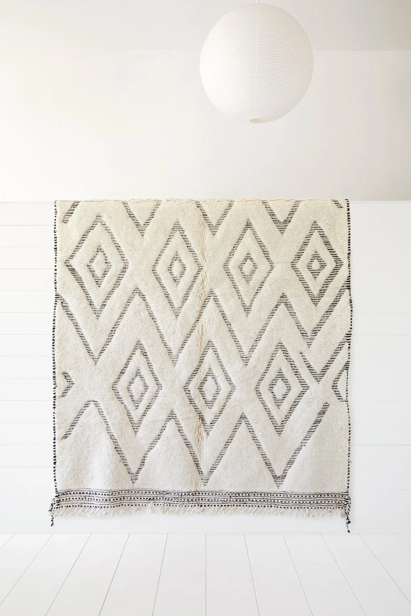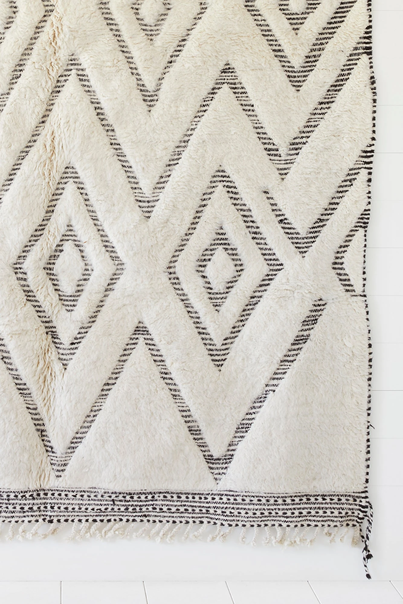 The most luxurious of the Moroccan rugs, our Beni Ourains are traditional yet feel modern with their neutral two-tone geometric patterns. Simple yet sumptuous- the signature high-pile of the Moroccan Beni Ourain adds warmth, comfort, and distinction to any space. The winding patterns and intricate borders set it apart from others like them, and make it the perfect statement piece for your living area or bedroom. This rug features a unique diamond and zigzag pattern and is the perfect size for placing under a queen-sized bed or creating a cozy foundation for two lounge chairs in your living space.