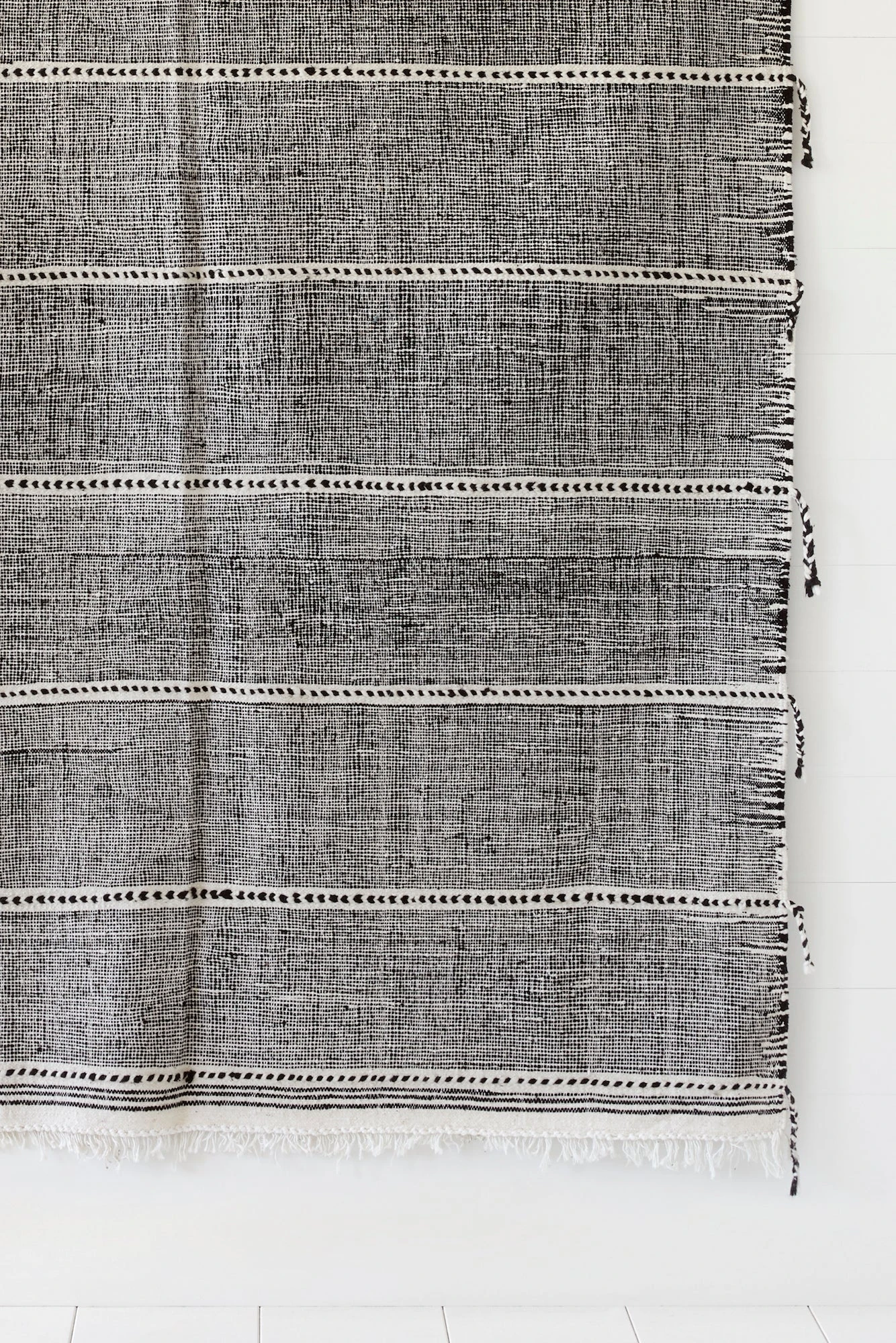 Our collection of flat woven Moroccan Kilim Rugs are selected for their classic bold and intricate geometric designs in a versatile two-tone colorway. Timeless and traveled, they make the perfect statement piece for any living area or bedroom. This rug features intricate thin lines with a large diamond pattern and two sides of fringe. It is the perfect size for placing under a queen-sized bed or creating a cozy foundation for two lounge chairs in your living space.