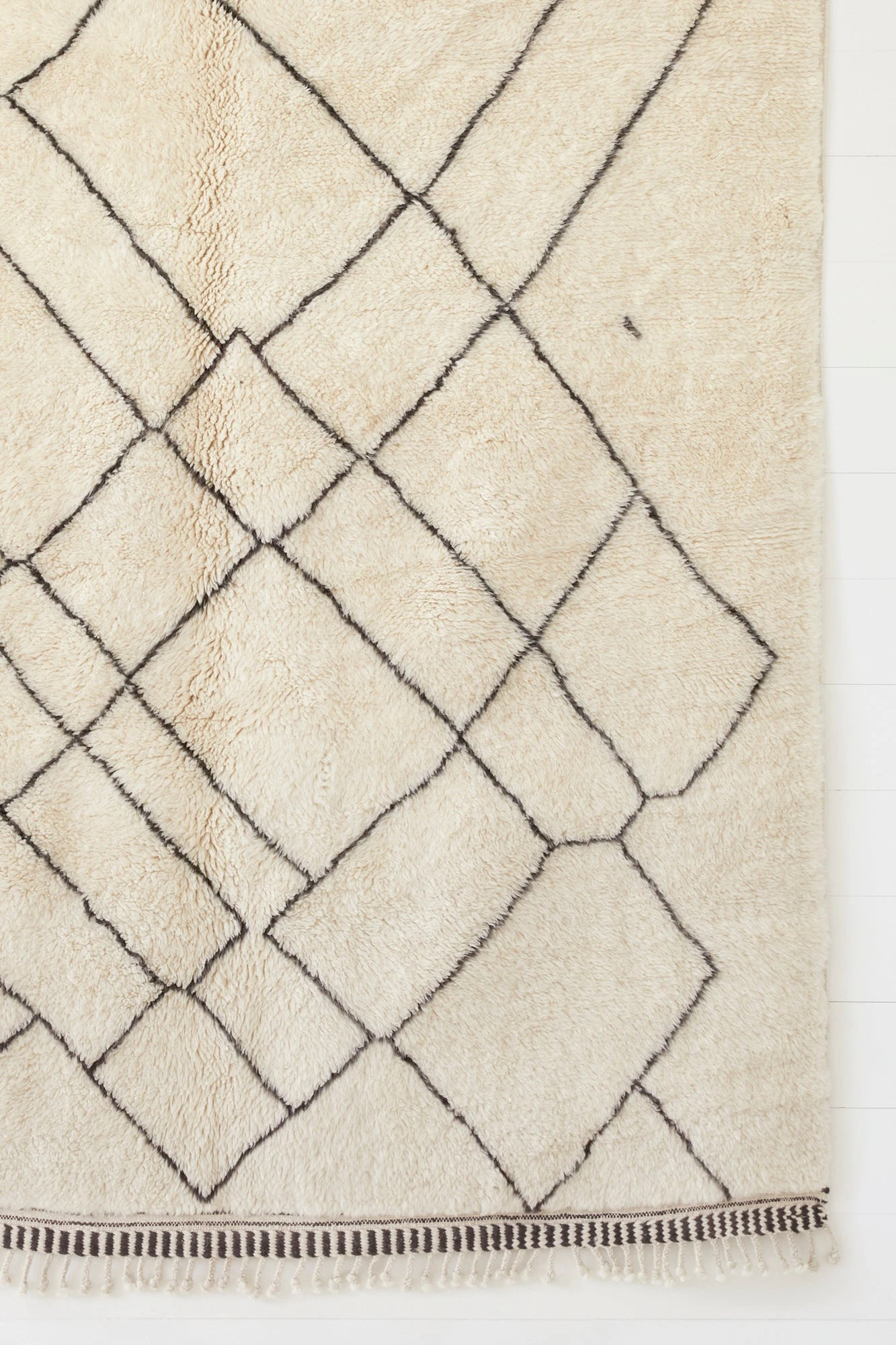 The craft of making these rugs is an ancient one, passed down from the tribal women of the Middle-Atlas Mountains from one generation to the next. Each rug is crafted by a single artisan over the course of weeks. They are inherently unique and one-of-a-kind, each reflecting the personality and mood of the woman weaving it. These rugs are skillfully hand-knotted from undyed sheep’s wool, creating a high pile with the most luxurious feel.