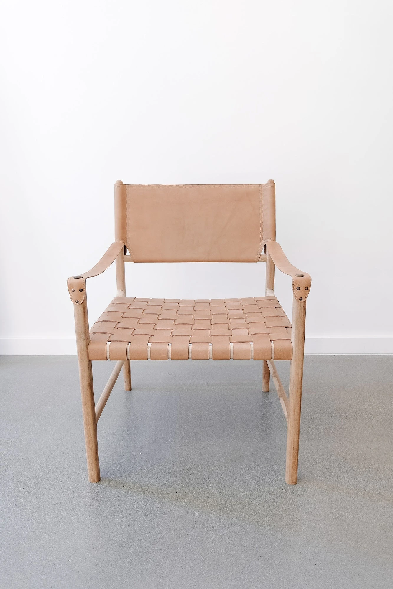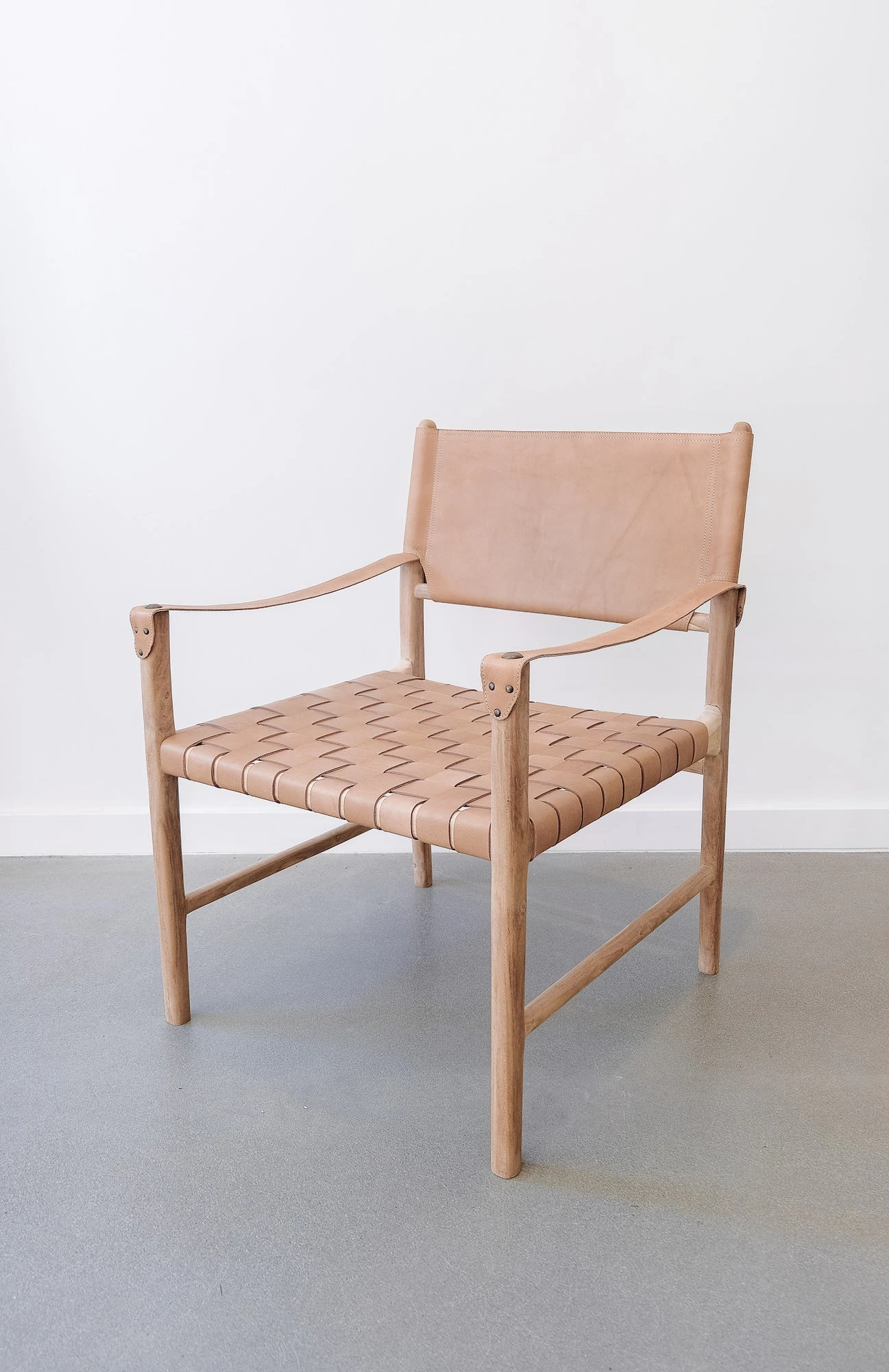 Contemporary lines, a roomy frame, and our signature woven leather – a nod to the classic safari chair but with a Saffron + Poe twist. This lounge chair features a generously proportioned teak frame in a natural matte finish, a woven leather strap seat, and a stretched leather back in our versatile beige colorway. Leather arm rests add comfort and style affixed with oversized antiqued copper nailheads. Comfortable and versatile, this piece works with nearly any style aesthetic and is equally excellent for a living room, study, or spacious master bedroom. Pair with our leather folding stool for a sophisticated and relaxed vibe. These chairs are expertly handcrafted in Bali with Javanese teak wood and leather.