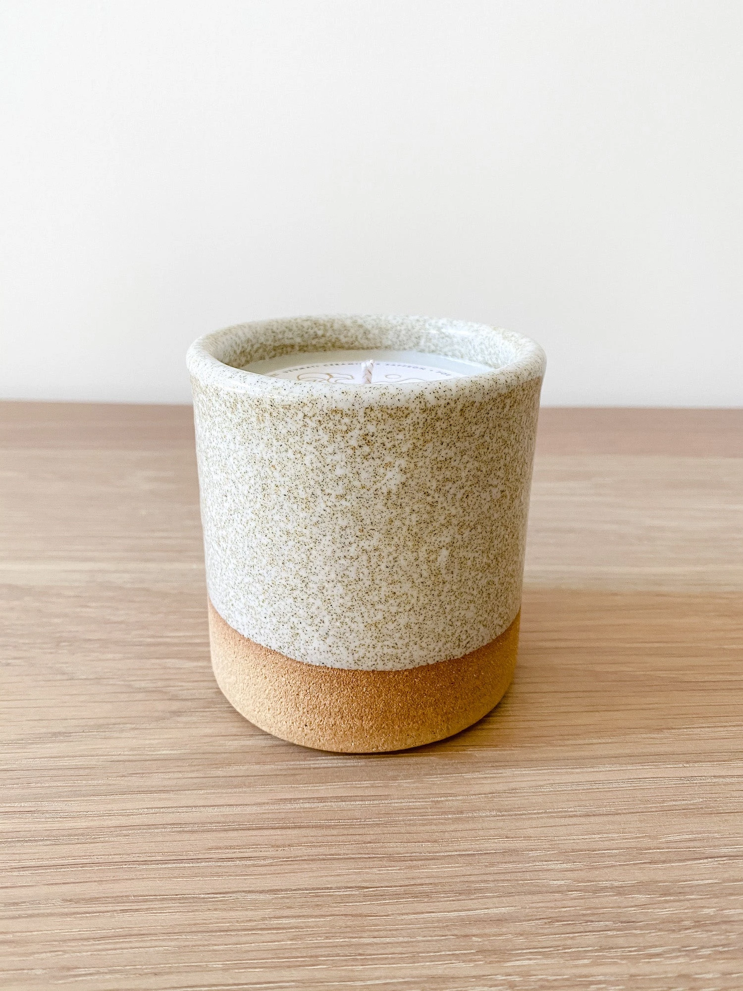 The modern rustic stoneware vessel is artfully glaze-dipped with exposed raw stoneware. The base is a warm sand toned and textured stoneware topped with speckled iron-rich white glaze. The vessel can later be repurposed as a tumbler or to hold tea lights!