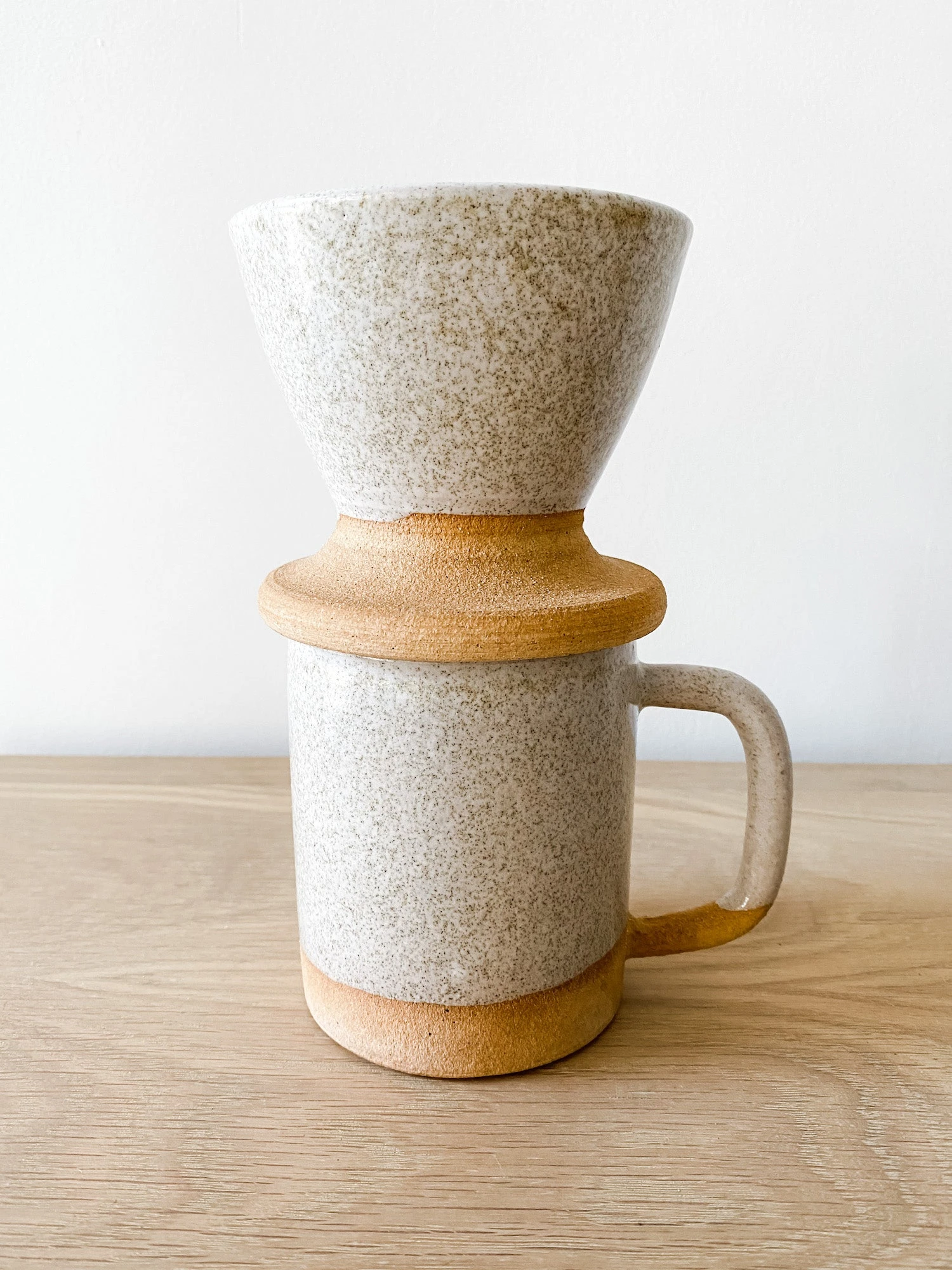 Be your own barista with this gorgeous form-meets-function kitchen accessory. This modern rustic stoneware pour over delivers a cafe-worthy cup of coffee right from your own home. It features a base of warm sand toned and textured stoneware topped with speckled iron-rich white glaze. This single cup pour over fits a size 2 filter and is the perfect companion to your Uzumati Bodie Mug.