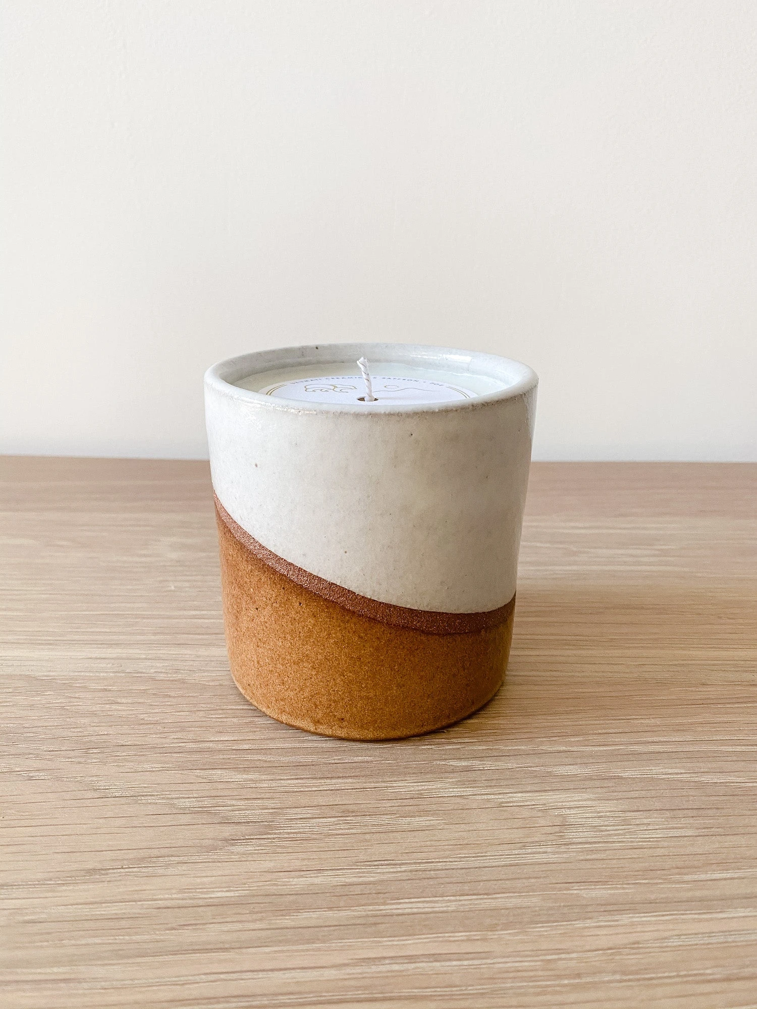The modern rustic stoneware vessel is artfully glaze-dipped with exposed raw stoneware. The vessel features a white glaze top and rust glaze base with a stripe of unglazed stoneware in the center. The vessel can later be repurposed as a tumbler or to hold tea lights!