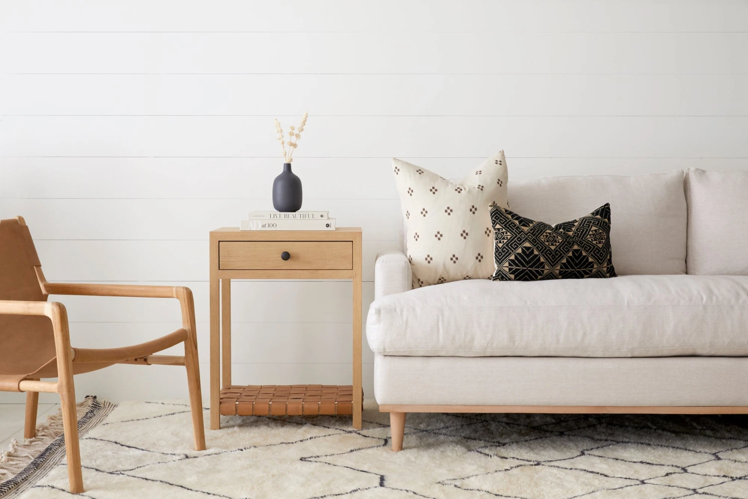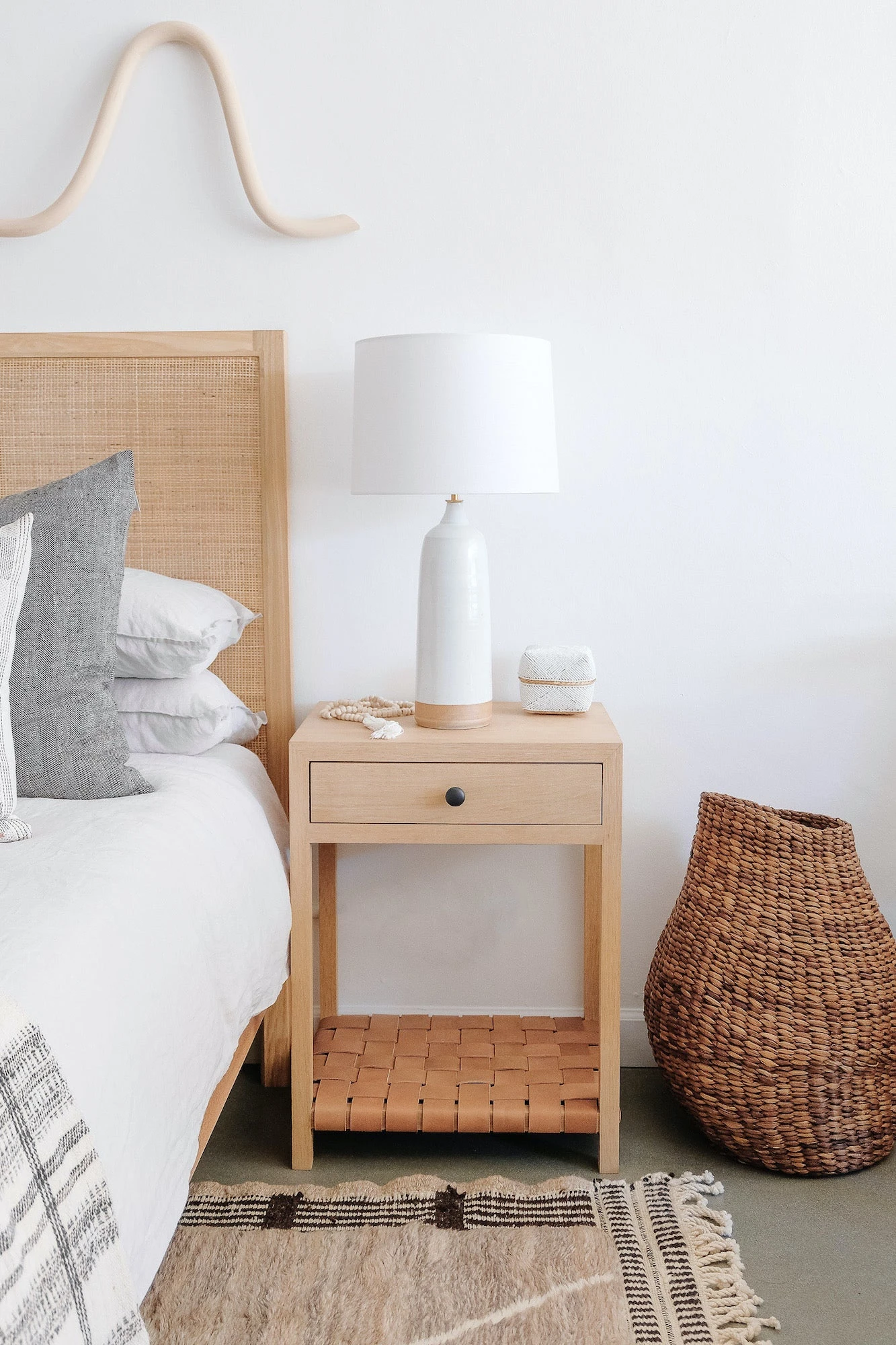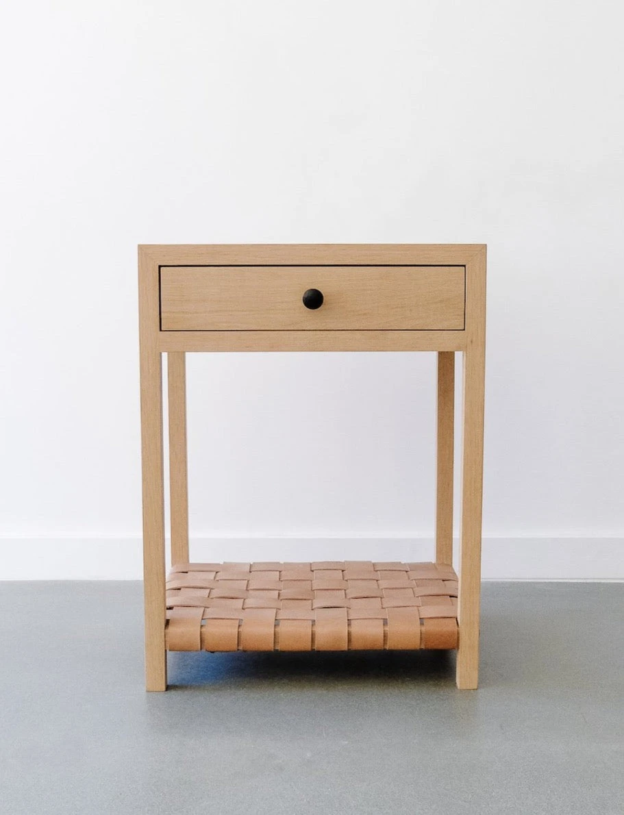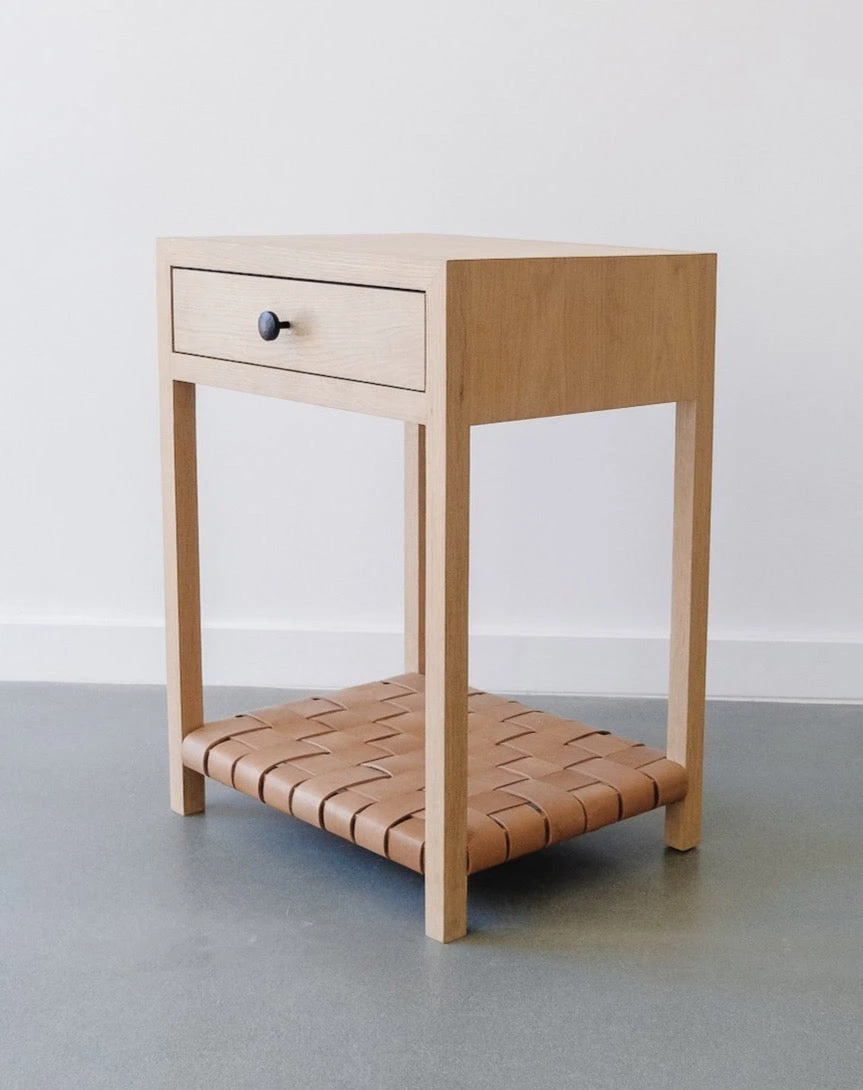 Crisp lines, an airy open frame, and the organic softness of leather accents. Made with luxurious natural materials, this white oak side table adds sophistication and a natural warmth to your bedroom or living space. Designed for form and function, it features a practical soft close drawer to tuck things out of sight and an open storage shelf made with our signature leather strapping. Its frame of white oak has a soft matte finish to showcase the wood’s natural color and grain. Drawer pulls feature a hammered matte black finish. Inspired by the natural beauty of our coastal home and designed for everyday luxury, this side table is the epitome of our California casual style.