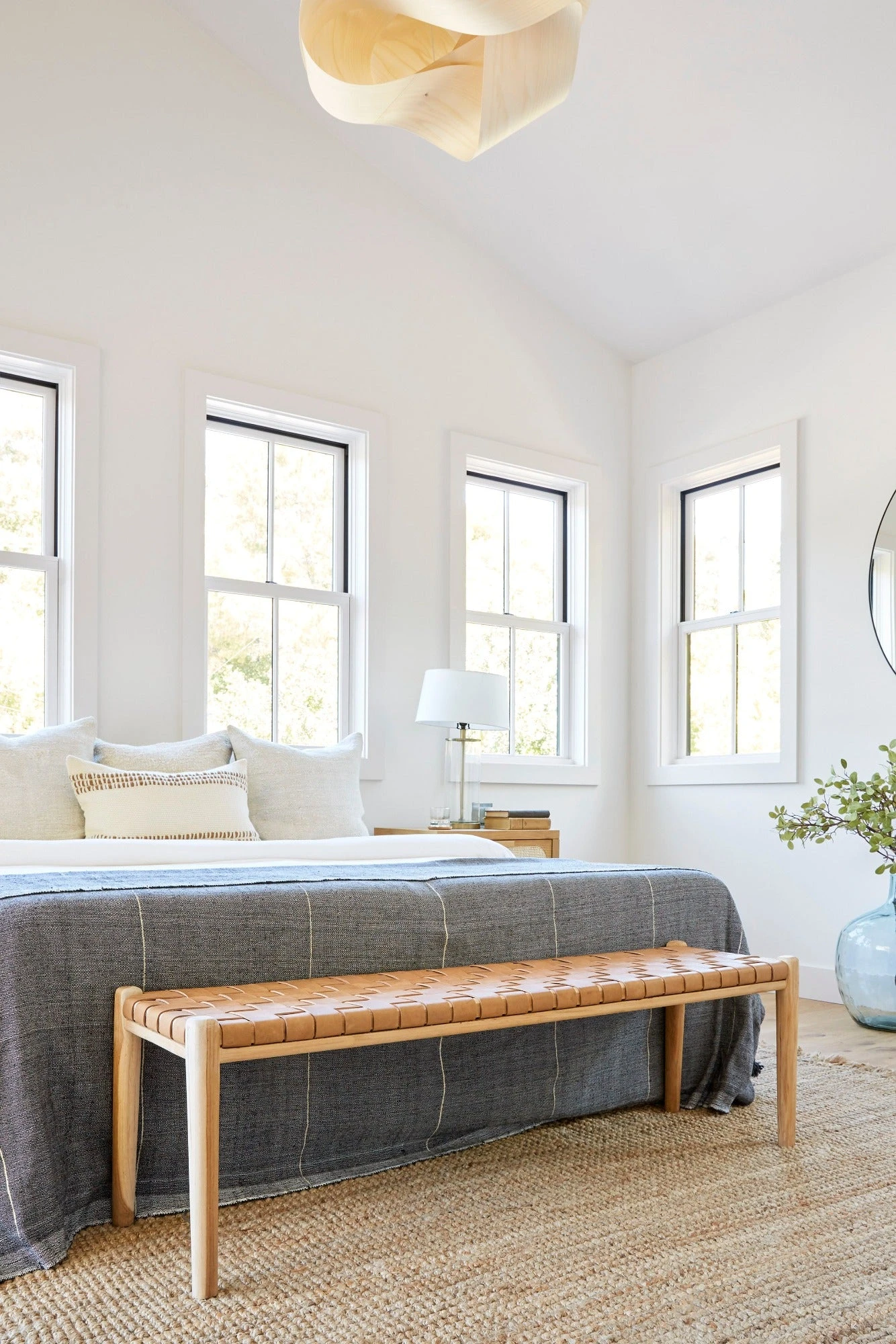 This effortlessly elegant woven leather bench is as versatile as they come. It makes the perfect landing spot in your foyer or at the foot of your bed, and can even conveniently be used as additional dining room seating while entertaining. This bench has a teak frame featuring turned legs in a nod to mid-century aesthetic and a seat of woven leather straps in our versatile beige colorway. However it’s used, it’s sure to give your space added comfort and style. These benches are expertly handcrafted in Bali with Javanese teak wood and leather.