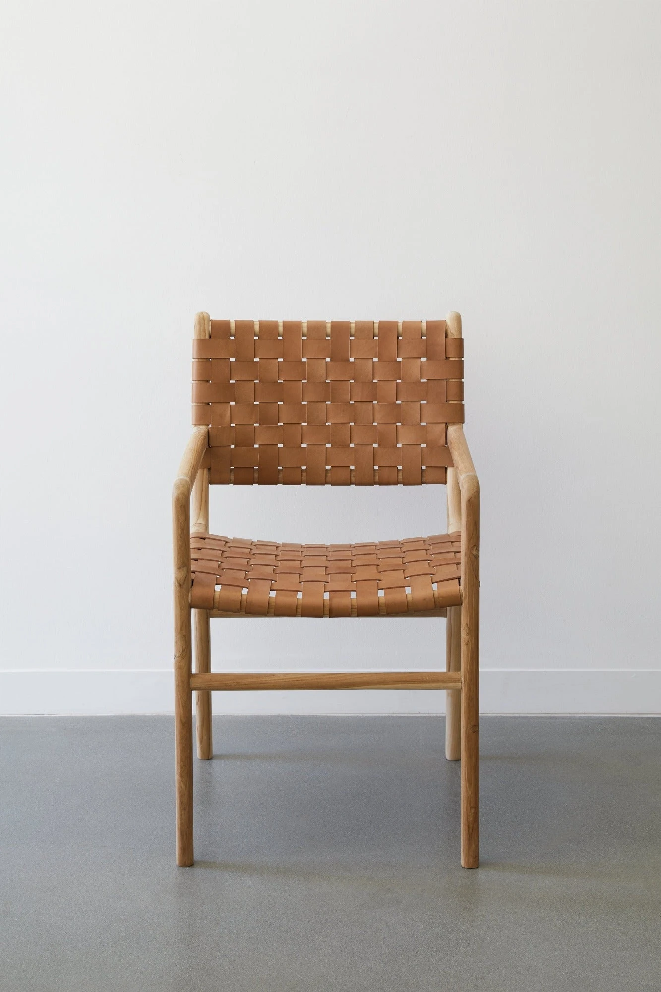 Our best selling woven leather strap dining chair is now available with arms! Contemporary with echos of Scandinavian and bohemian influence, this woven leather dining chair is both modern and timeless. Featuring clean lines of sculpted teak wood and woven beige leather, this chair work perfectly with a variety of tables + design aesthetics.