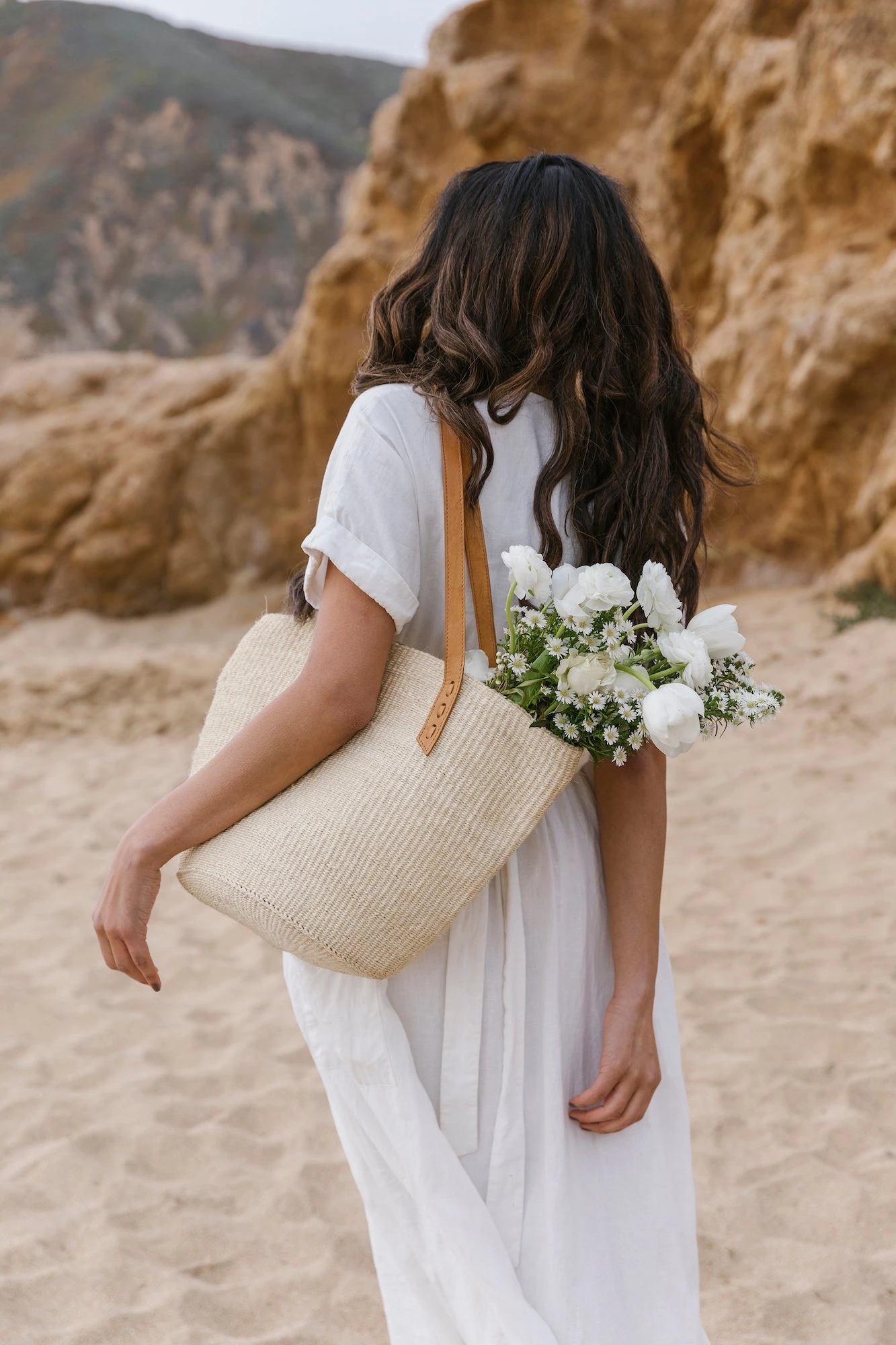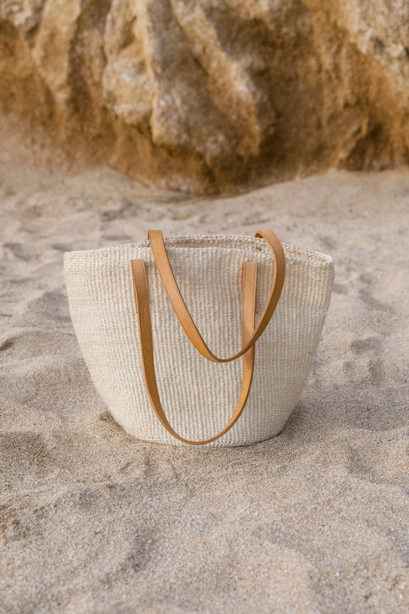 Our Woven Sisal and Leather Tote is chic and casual perfection. Made from sturdy woven cream colored sisal giving it structure with timeless leather straps. This roomy tote is the perfect size for your daytime outings. Roomy enough for a lightweight beach towel and a good book or for toting your laptop along with your daily necessities.
